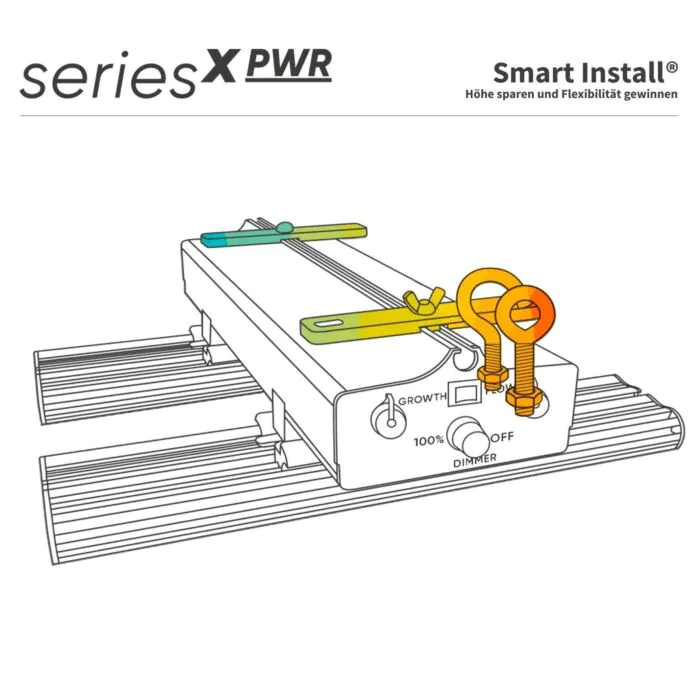 Im Alltag bedeutet das: Du steuerst die Lampe über 4 Dimmstufen am Gerät (Drehregler/Kippschalter-Konzept) und kannst die Leistung im Wuchsmodus bis 80W und im Blütemodus bis 160W abrufen. Wer noch feiner arbeiten will, kann die externe Steuerung via GC-SIGNAL Controller nutzen (dann ist eine Dimmung in 1%-Schritten möglich). Auch bei der Montage hat Greenception den Fokus klar auf Praxis gelegt: Die Serie X PWR ist auf die gängigen quadratischen Zeltgrößen abgestimmt, und mit dem Smart Install®-System sind verschiedene Aufhängesituationen möglich – inklusive der Option, das System platzsparend zu montieren. Elektrisch ist die Lampe breit aufgestellt (100–277 V AC) und damit problemlos an 230V betreibbar. Die Bauform bleibt dabei bewusst kompakt (40 × 40 × 11 cm), was Planung und Positionierung im Zelt vereinfacht. Hinweis für den Betrieb: UV-Anteile sind Teil des Spektrums – deshalb wie bei jeder Grow-LED nicht direkt in eingeschaltete LEDs schauen und die Beleuchtung so konfigurieren, dass Pflanzen und Arbeitsabläufe sauber zusammenpassen.