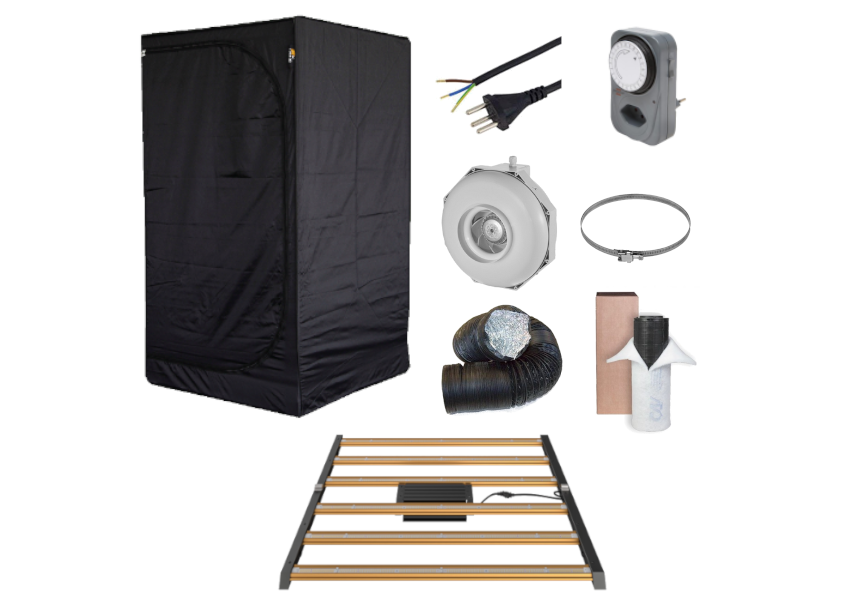 Einfache Growbox zum starten deines Projekts mit Lüftung und Lampen. Übersicht Growbox: 1x Mammoth, Classic+ - 100 Vorschaltgerät: 1x Elektronisches Vorschaltgerät - 600W dimmbar Lampe: 1x Osram - Plantastar, HPS 400 Watt Reflektor: 1x Reflektor, Stukko Lampenaufhängung: 1x Lampen JoJo Set Abluftventilator: 1x Can Fan, Rohrventilator RK 100L - 270M³/H Aktivkohlefilter: 1x Can Lite Aktivkohlefilter 100mm - 300M³/H Lüftungsschlauch: 1x Lüftungsschlauch COMBI 100mm - 10m Zubehör: 1x Bride 1x Kabel für Lüfter 1x Brennstuhl Zeitschaltuhr 1x Mammoth - Thermo-/Hygrometer XXL50cm Alutape