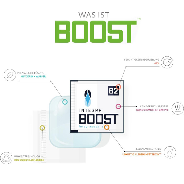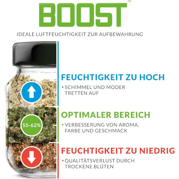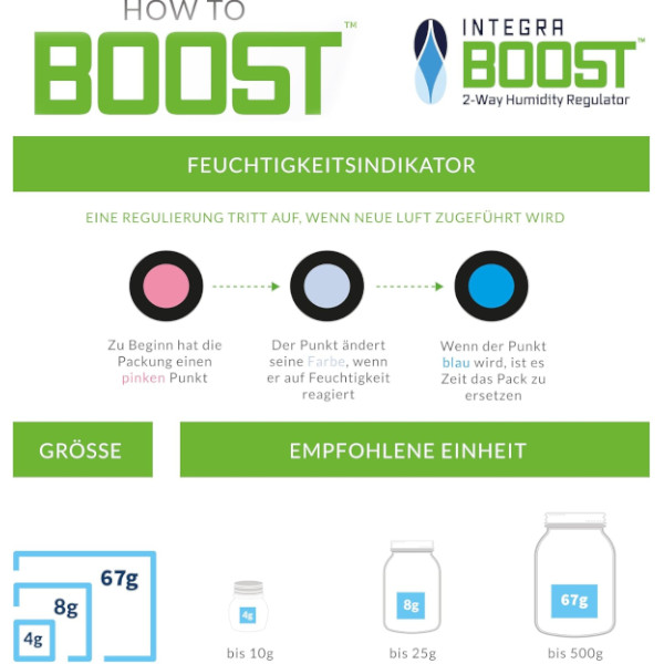 Integra Boost Humidity Control reguliert die relative Luftfeuchtigkeit und konserviert dadurch das Aroma und die Frische von Pflanzenblüten oder Tabak. Beim Trocknen und lagern ist die richtige Luftfeuchtigkeit ein Schlüsselfaktor. Zu viel Luftfeuchtigkeit und es entsteht Schimmel, welcher die Inhaltsstoffe zersetzt. Zu wenig Luftfeuchtigkeit und die Blüten oder der Tabak wird zu trocken, verändert sein Aroma und wird unangenehm zu rauchen.