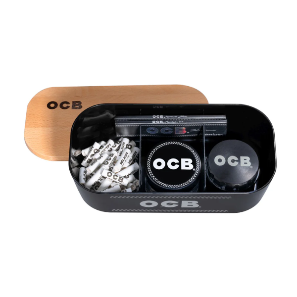 Die OCB Rolling Box mit Tray ist die stilvolle und praktische Lösung zur geordneten Aufbewahrung deines gesamten Raucherzubehörs. Die Box besteht aus einem robusten Kunststoff-Behälter mit mehreren Fächern, der durch einen hochwertigen Holzdeckel verschlossen wird. Dieser Deckel dient gleichzeitig als praktisches **Rolling Tray (Drehunterlage)**. Der beigelegte Gummizug sichert den Inhalt für den Transport. Mit diesem 2-in-1-Tool hast du Papers, Tips, Filter und Grinder immer an einem aufgeräumten Ort.